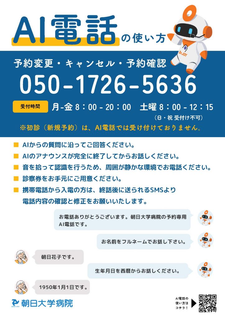 予約変更・キャンセル・予約確認はAI電話が承ります! pick up2026.03.04 朝日大学病院_チラシ_20260217 最新情報 すべてのお知らせ 2026 2025 2024 2023 2022 2021 2020 2019 2018 イベント pick up 最新医療機器 看護部 インターンシップ 看護週間の取り組み ふれあい看護体験 イベント 採用 臨床研修医 臨床研修歯科医 医師 看護師 医療職員 事務・その他 パートタイマー 脊椎センター 一覧に戻る