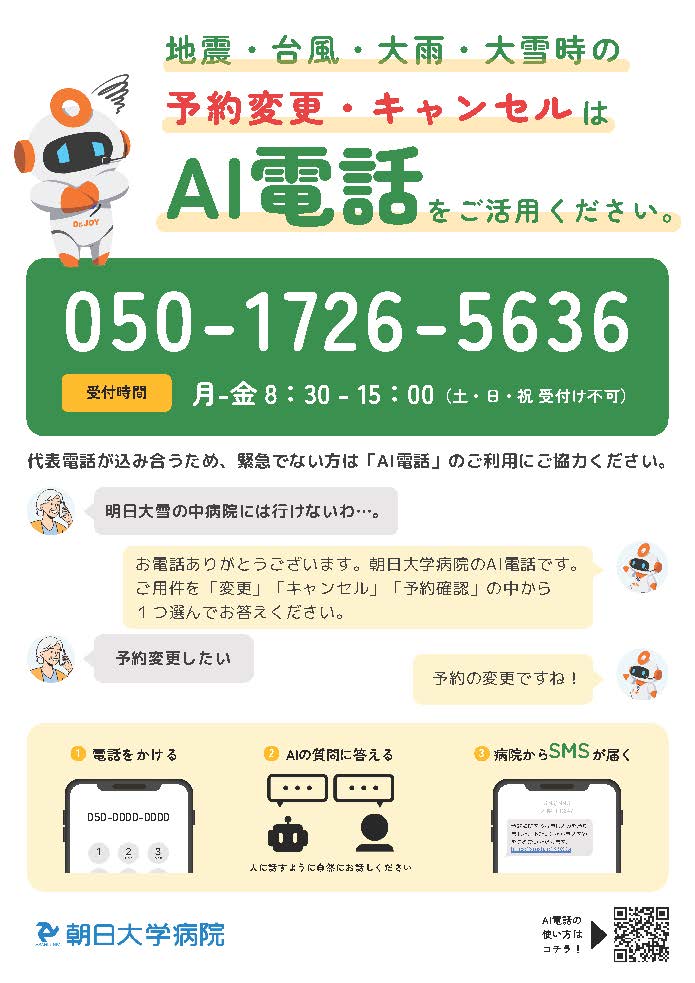 地震・台風・大雨・大雪時の予約変更・キャンセルは AI電話をご活用ください。 pick up2025.12.02 最新情報 すべてのお知らせ 2025 2024 2023 2022 2021 2020 2019 2018 イベント pick up 最新医療機器 看護部 インターンシップ 看護週間の取り組み ふれあい看護体験 イベント 採用 臨床研修医 臨床研修歯科医 医師 看護師 医療職員 事務・その他 パートタイマー 脊椎センター 一覧に戻る