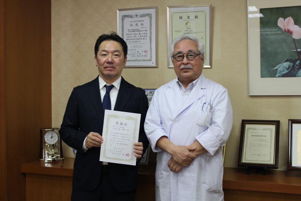 入院患者さんに膝掛けのクリスマスプレゼント イベント2025.12.22 2025年12月22日(月) 森プリント株式会社(岐阜県羽島郡笠松町)の森典義社長、いちだクリニック(岐阜市清本町)の市田正成院長から、入院患者さん全員にクリスマスプレゼントとして膝掛け等が贈られました。素敵なクリスマスプレゼントをありがとうございました。 (写真左:森プリント株式会社 専務取締役 片桐正和 様)